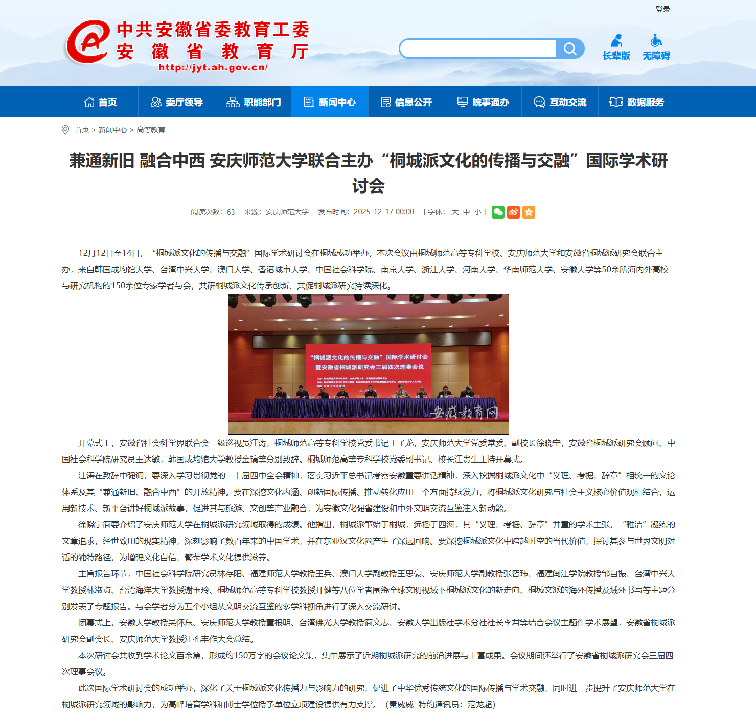 【安徽教育网】兼通新旧 融合中西 37000cm威尼斯联合主办“桐城派文化的传播与交融”国际学术研讨会https://jyt.ah.gov.cn/xwzx/gdjy/40776776.html