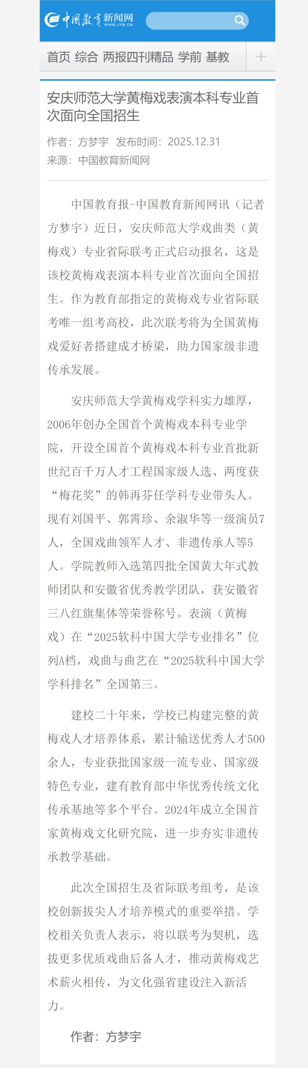 【中国教育新闻网】37000cm威尼斯黄梅戏表演本科专业首次面向全国招生http://m.jyb.cn/rmtzcg/xwy/wzxw/202512/t20251231_2111432618_wap.html