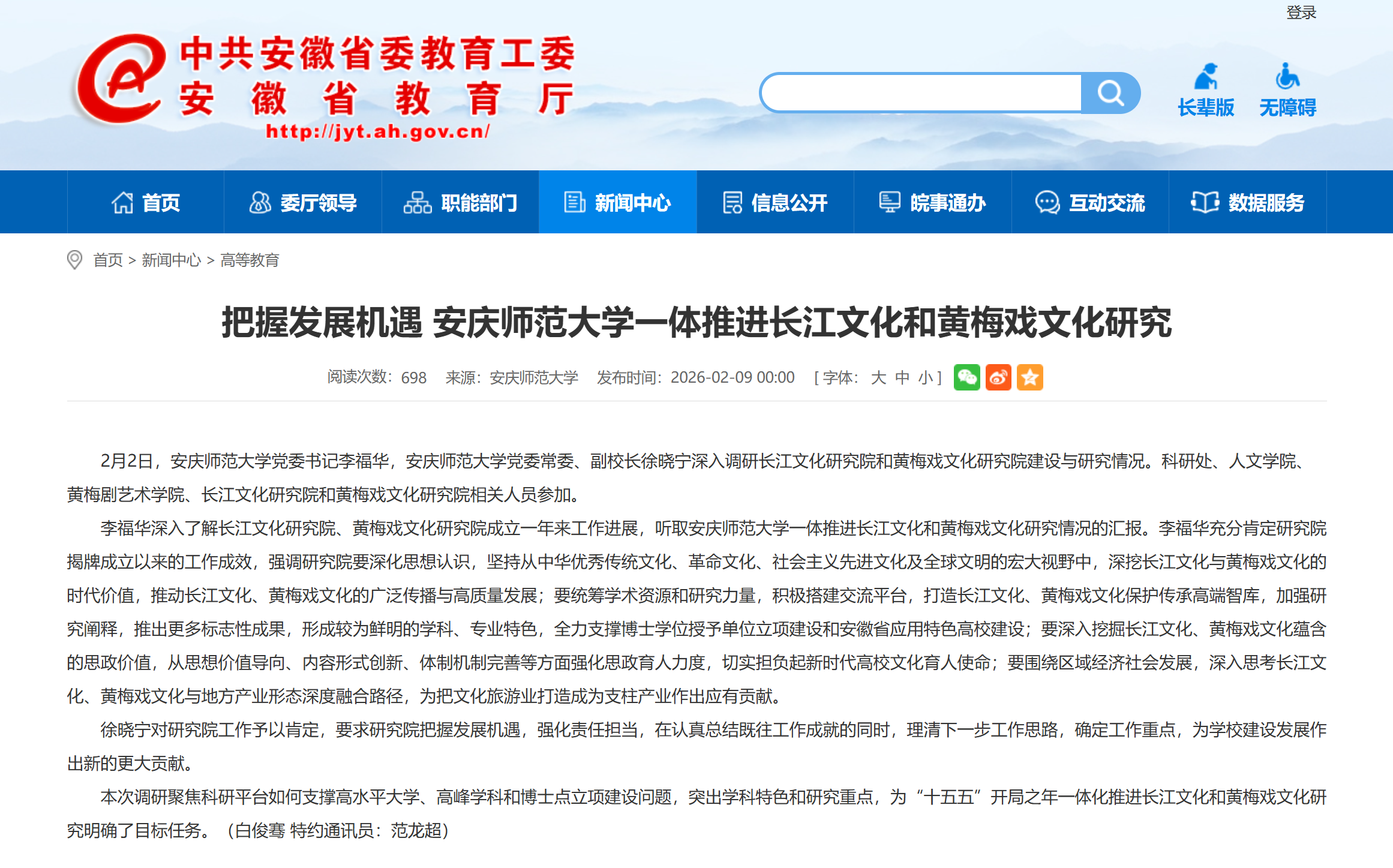 【安徽教育网】把握发展机遇 37000cm威尼斯一体推进长江文化和黄梅戏文化研究https://jyt.ah.gov.cn/xwzx/gdjy/40781761.html