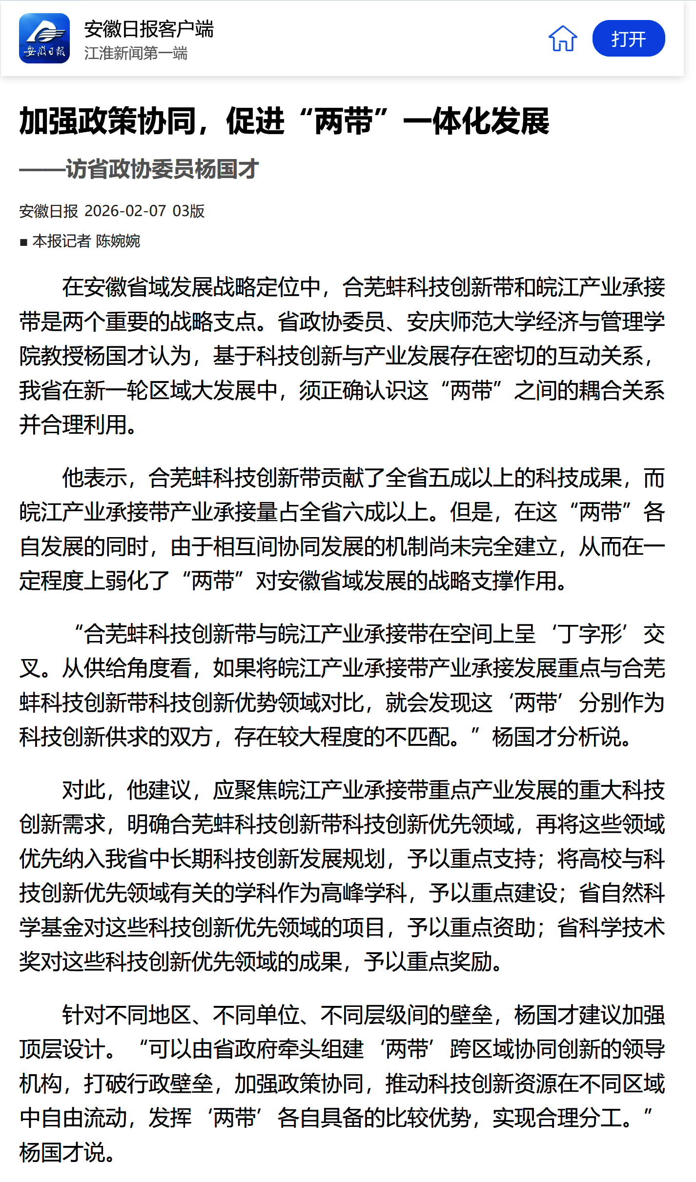 【安徽日报】加强政策协同,促进“两带”一体化发展——访省政协委员杨国才https://app.ahnews.com.cn/displayTemplate/news/newsDetail/1124770.html?isDigital=true&isShare=true