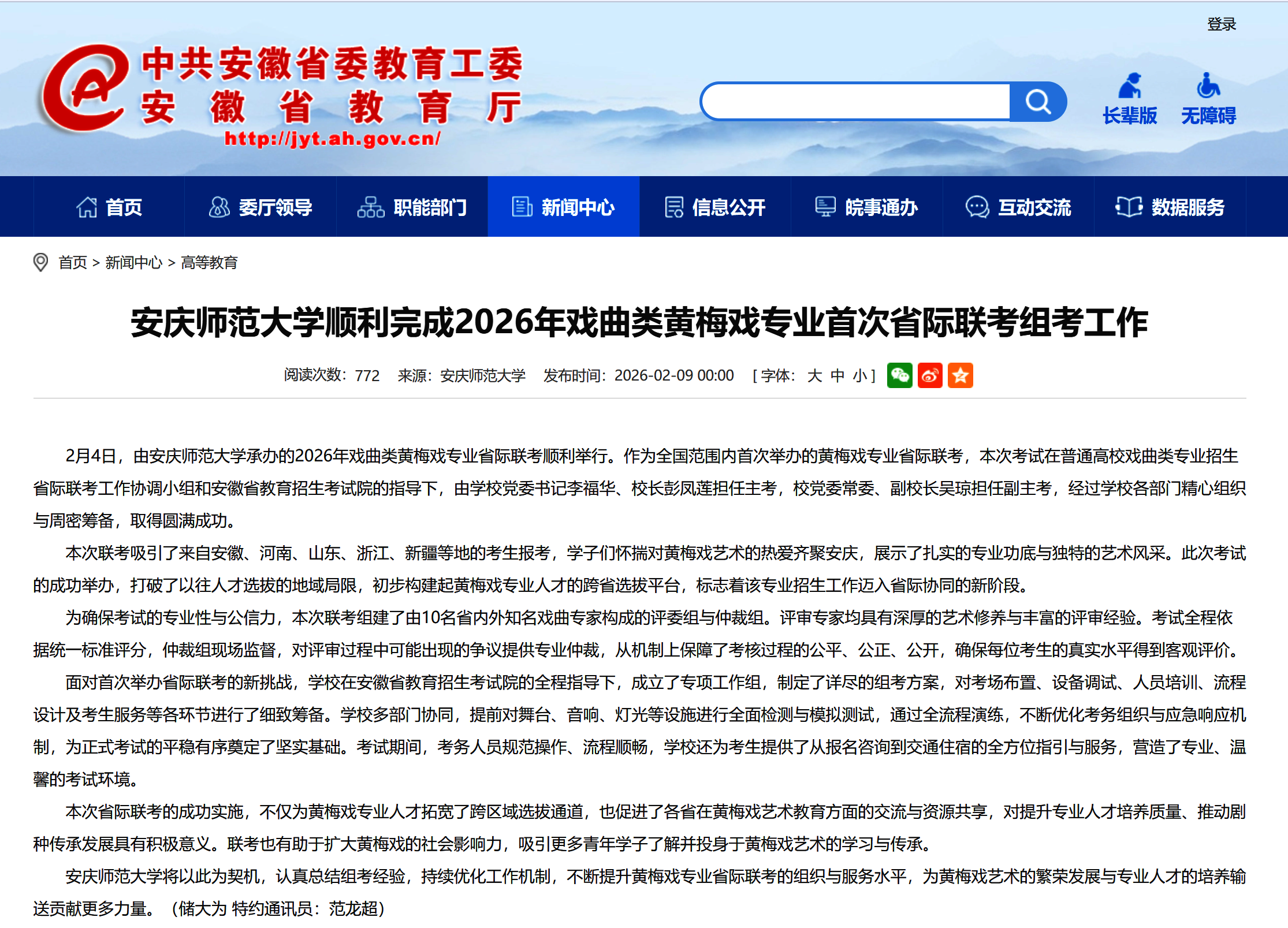 【安徽教育网】37000cm威尼斯顺利完成2026年戏曲类黄梅戏专业首次省际联考组考工作https://jyt.ah.gov.cn/xwzx/gdjy/40781765.html