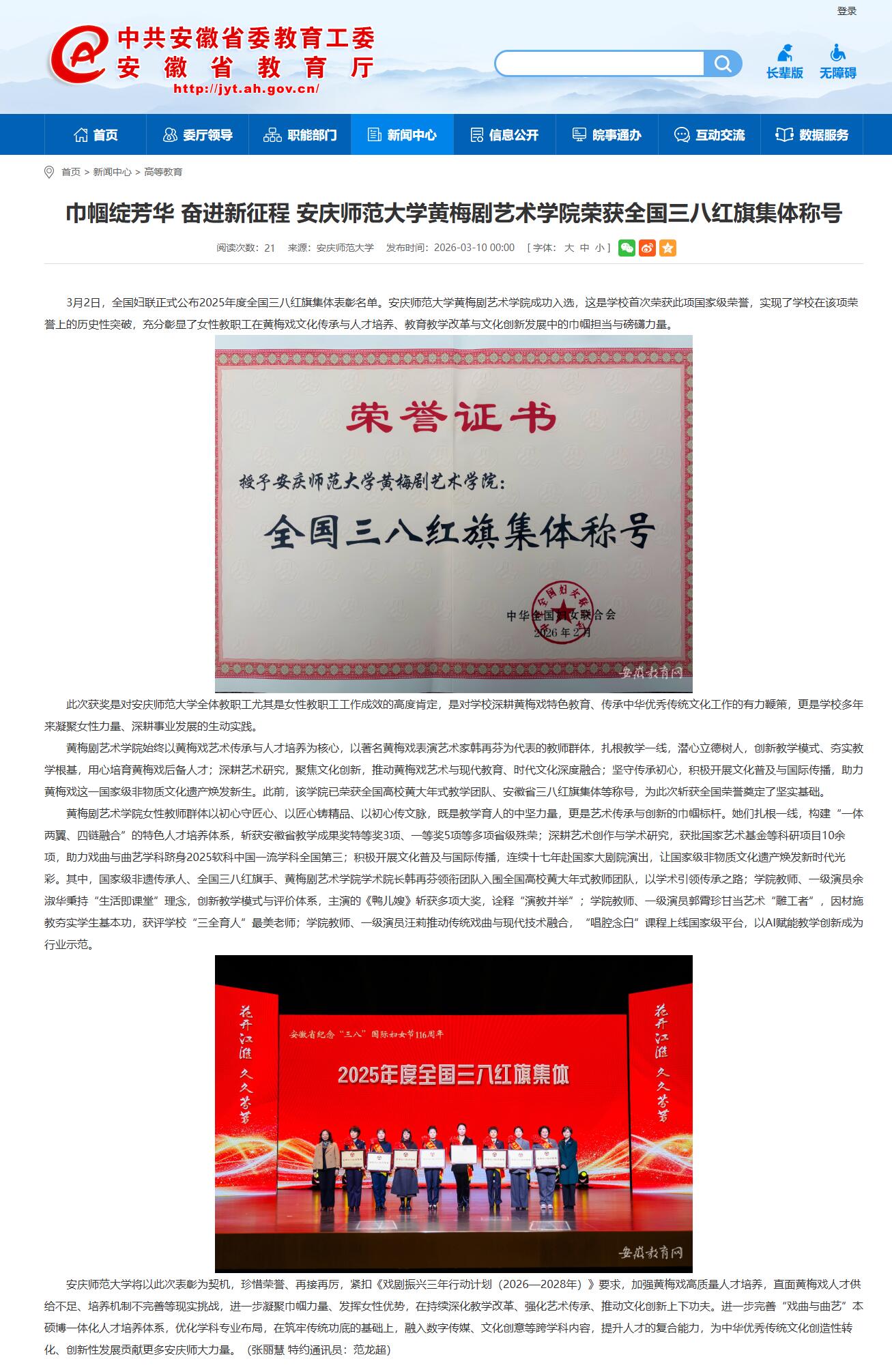 安徽新闻网:巾帼绽芳华 奋进新征程 37000cm威尼斯黄梅剧艺术学院荣获全国三八红旗集体称号