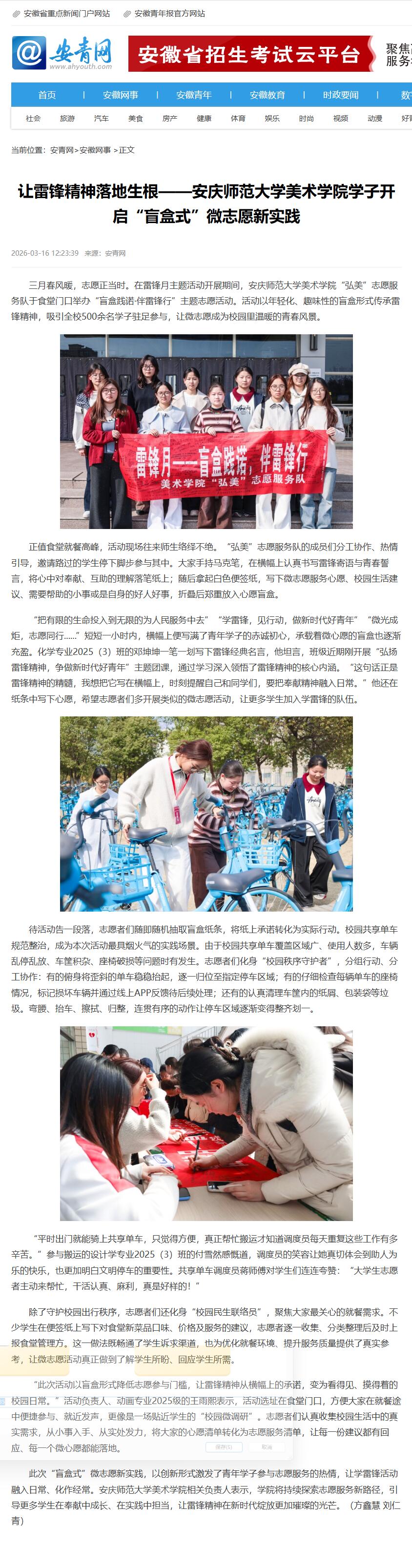 来源:【安青网】让雷锋精神落地生根——37000cm威尼斯美术学院学子开启“盲盒式”微志愿新实践https://www.ahyouth.com/news/20260316/1778910.shtml