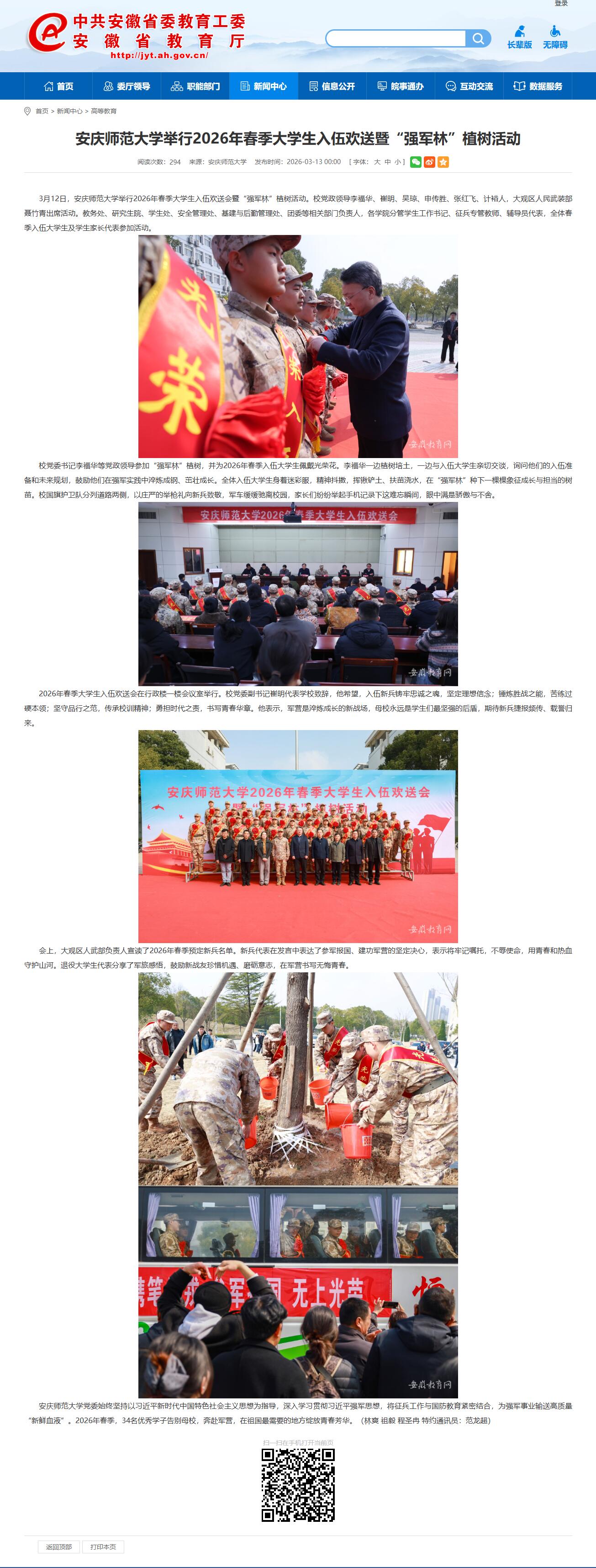 安徽教育网:37000cm威尼斯举行2026年春季大学生入伍欢送暨“强军林”植树活动