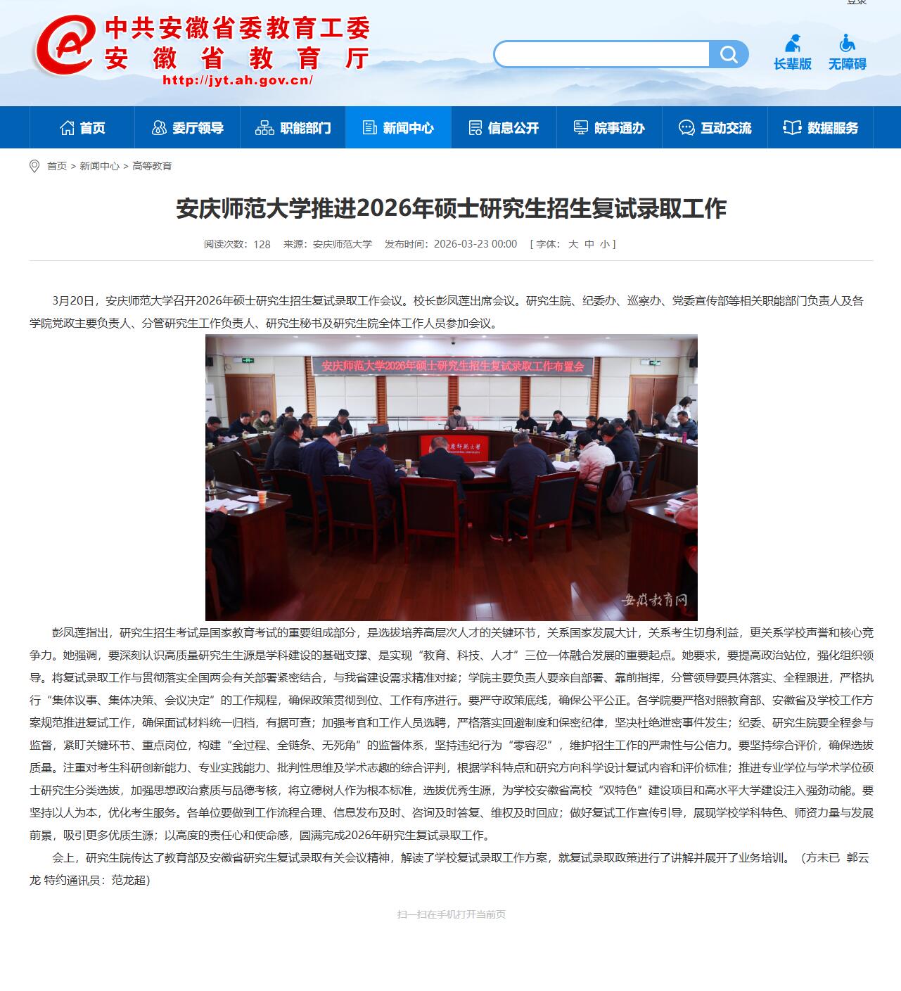 来源:【安徽教育网】37000cm威尼斯推进2026年硕士研究生招生复试录取工作https://jyt.ah.gov.cn/xwzx/gdjy/40784983.html