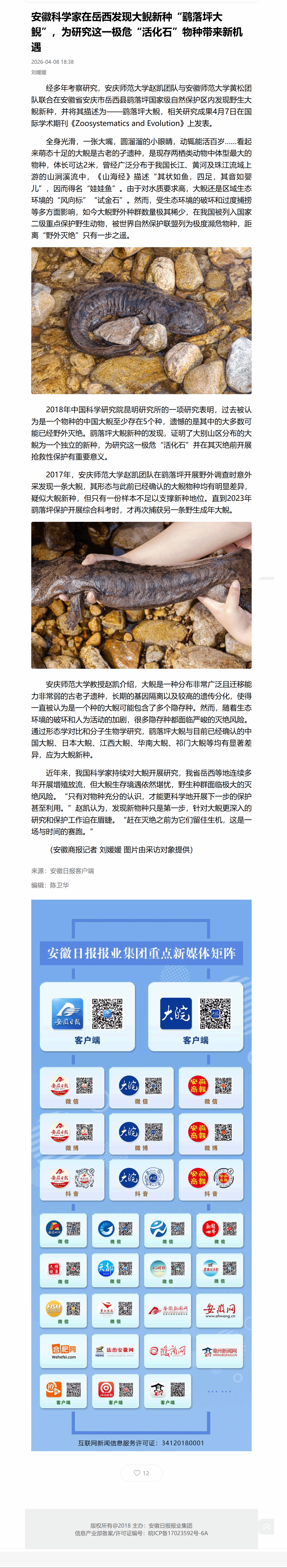 来源:【安徽日报】安徽科学家在岳西发现大鲵新种“鹞落坪大鲵”,为研究这一极危“活化石”物种带来新机遇https://app.ahnews.com.cn/displayTemplate/news/newsDetail/5228/1727007.html?isShare=true&xyt=1775654672125