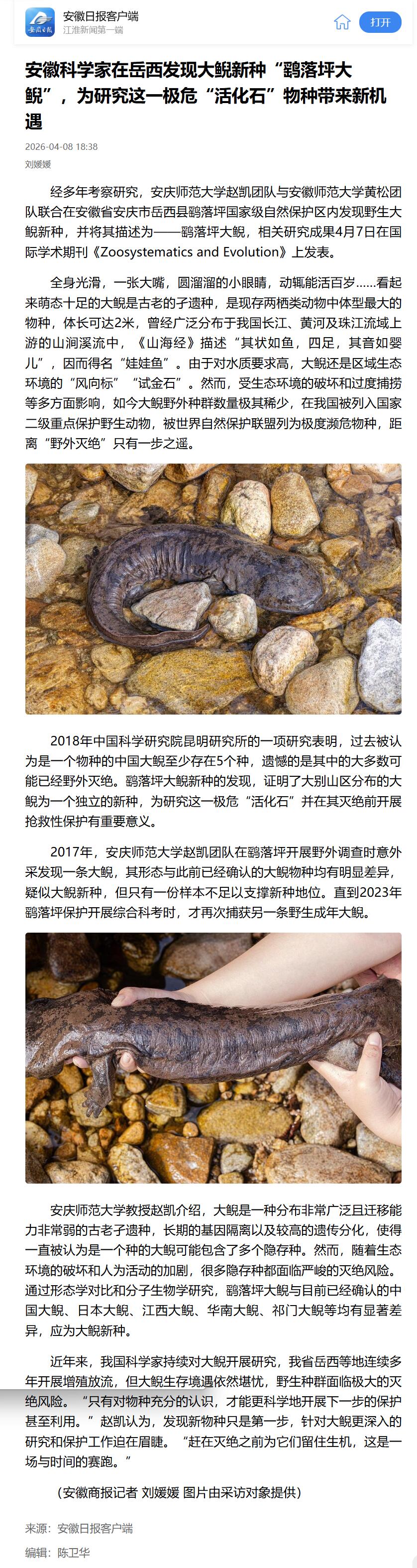来源:【安徽日报】安徽科学家在岳西发现大鲵新种“鹞落坪大鲵”,为研究这一极危“活化石”物种带来新机遇https://app.ahnews.com.cn/displayTemplate/news/newsDetail/5228/1727007.html?isShare=true&xyt=1775654672125