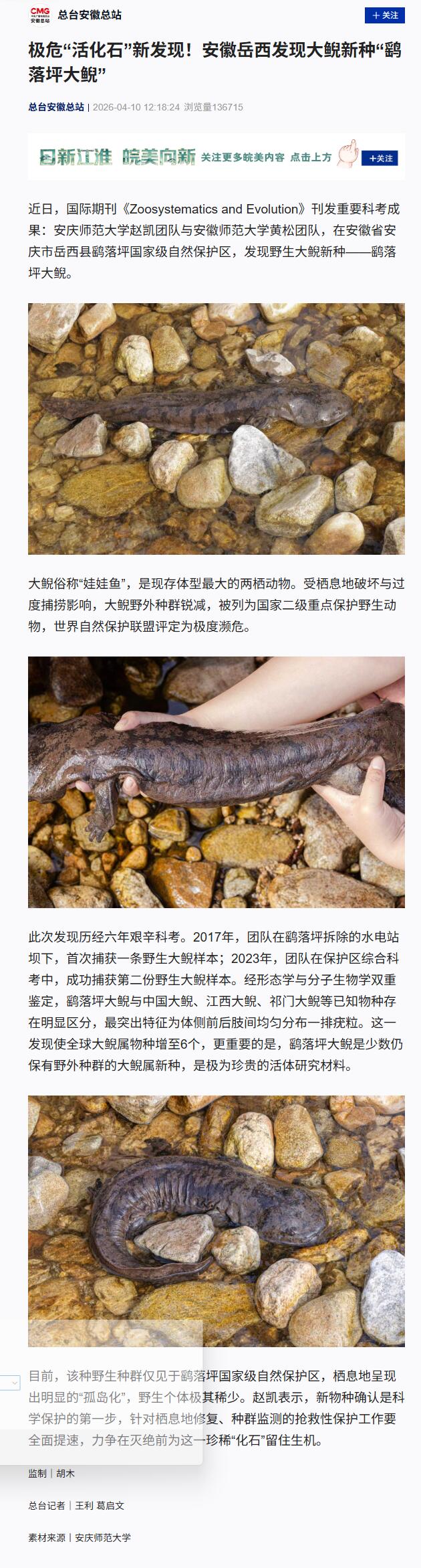 来源:【央视新闻】极危“活化石”新发现!安徽岳西发现大鲵新种“鹞落坪大鲵”https://content-static.cctvnews.cctv.com/snow-book/index.html?item_id=12190760307678173679&toc_style_id=feeds_default&track_id=8E3F40A5-4DE7-4098-9DB4-AB912795D5F9_797493732192&share_to=wechat