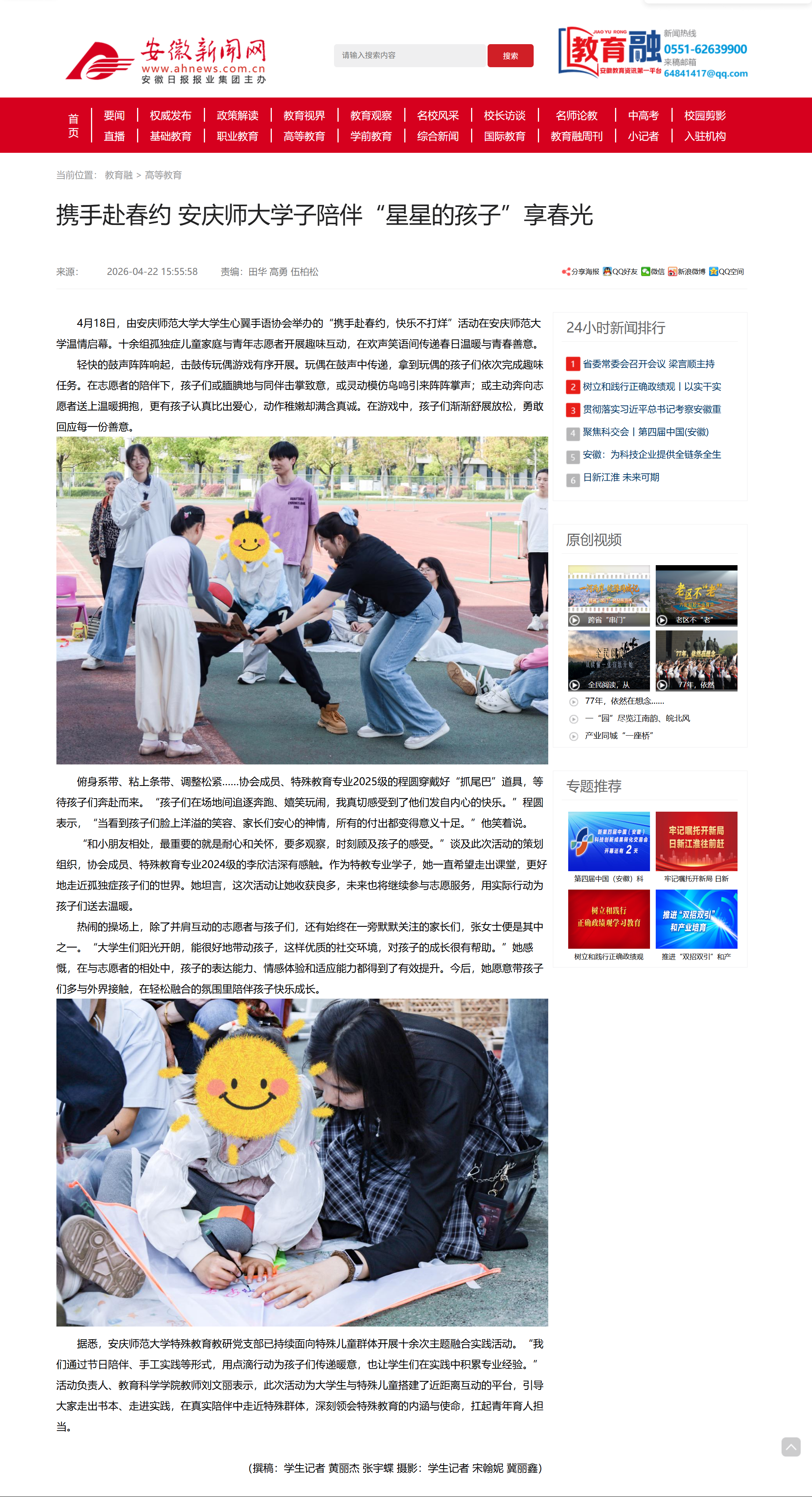 来源:【安徽新闻网】携手赴春约 安庆师大学子陪伴“星星的孩子”享春光http://xxt.ahnews.com.cn/news/2026/04/22/c_47614.htm