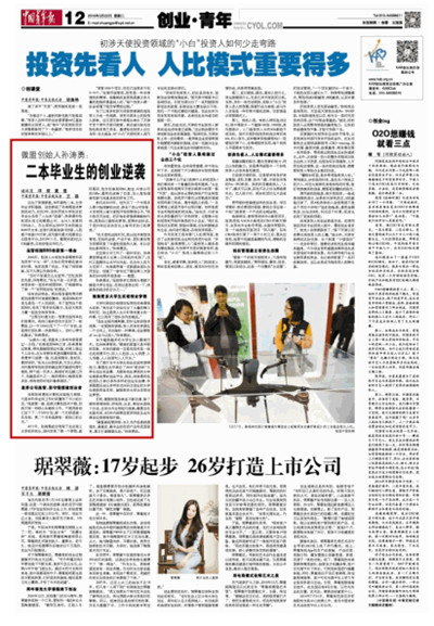 3月22日,《 中国青年报 》12 版“创业·青年”版刊登由威尼斯官网宣传部学生记者邓丽、夏莹和中国青年报记者王磊联合采写的《微盟创始人孙涛勇:二本毕业生的创业逆袭》,报道了威尼斯官网毕业生、微盟创始人孙涛勇追求梦想,创立国内最大的微信公众服务平台微盟的创业历程。