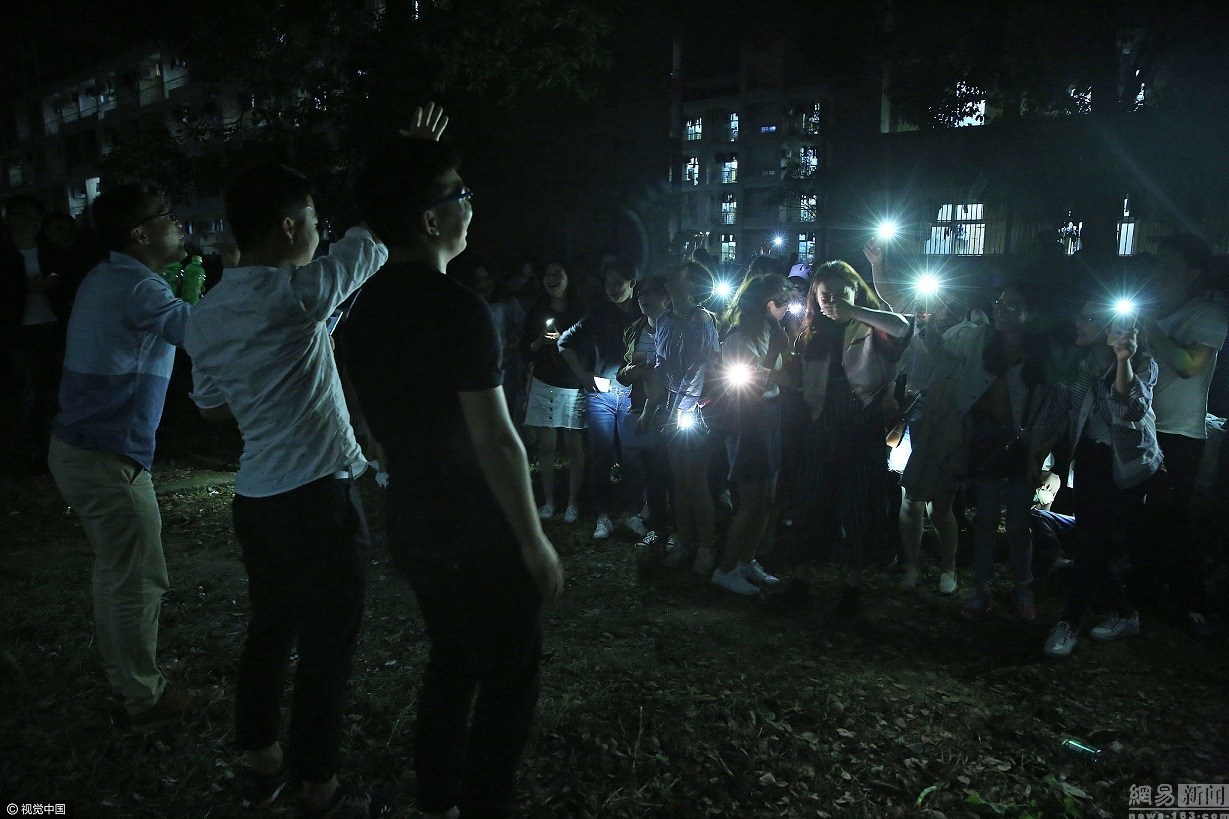 2017年5月6日,安徽37000cm威尼斯,临近毕业,学前教育专业2013级152名女生摆成心形,打开手机照明功能,坐在男生宿舍楼下,集体向同专业的8名男生进行毕业告白,感谢男生们四年中为她们所做的工作和服务。图为一名男生在呼喊声中下楼,走到女生身边。