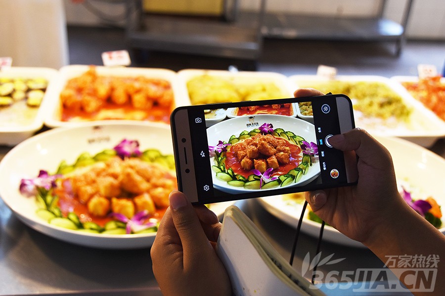 精美的摆盘雕花引起同学们的热议。“一开始担心中看不中吃,后来发现还挺不错的呢。这些菜颜值都很高,看起来就很诱人。”传媒学院广播电视学2016(1)班钱培培说。图为一位学生用手机将这些精美的菜肴拍下来。