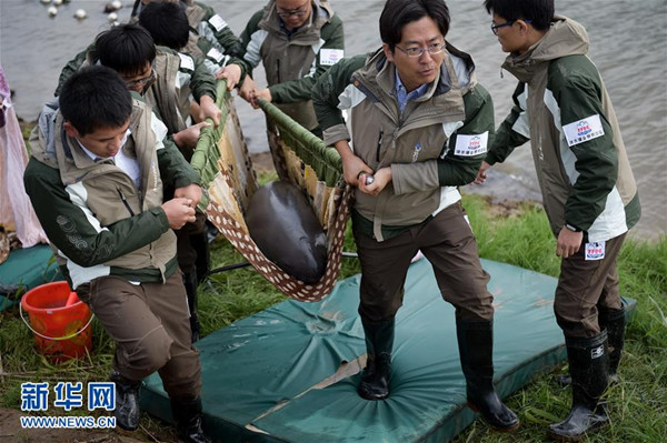 (新华网,11月10)11月10日,在安徽安庆市西江长江江豚迁地保护区,工作人员对从长江中捕捞的江豚进行迁地保护。